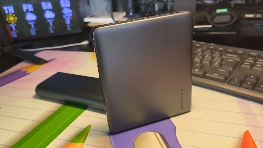 Amegat Laptop Power Bank 100W — отличный внешний аккумулятор по многим причинам, но больше всего он выделяется своим тонким корпусом, большой ёмкостью 20 000 мА·ч (74 Вт·ч) и высокой выходной мощностью 100 Вт. Очень мало таких внешних аккумуляторов, которые помещаются в сумку для ноутбука и при этом обеспечивают быструю зарядку, поэтому это мой любимый вариант для путешествий налегке.