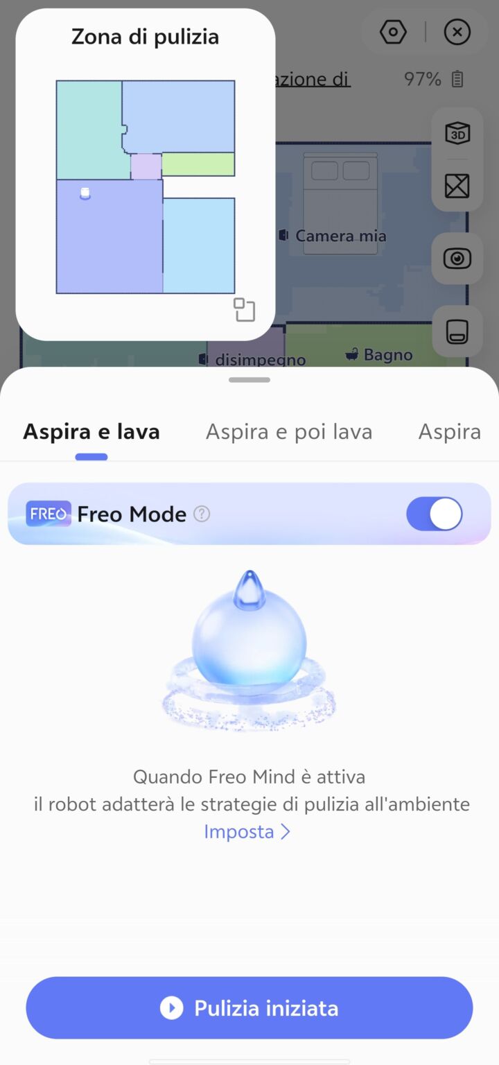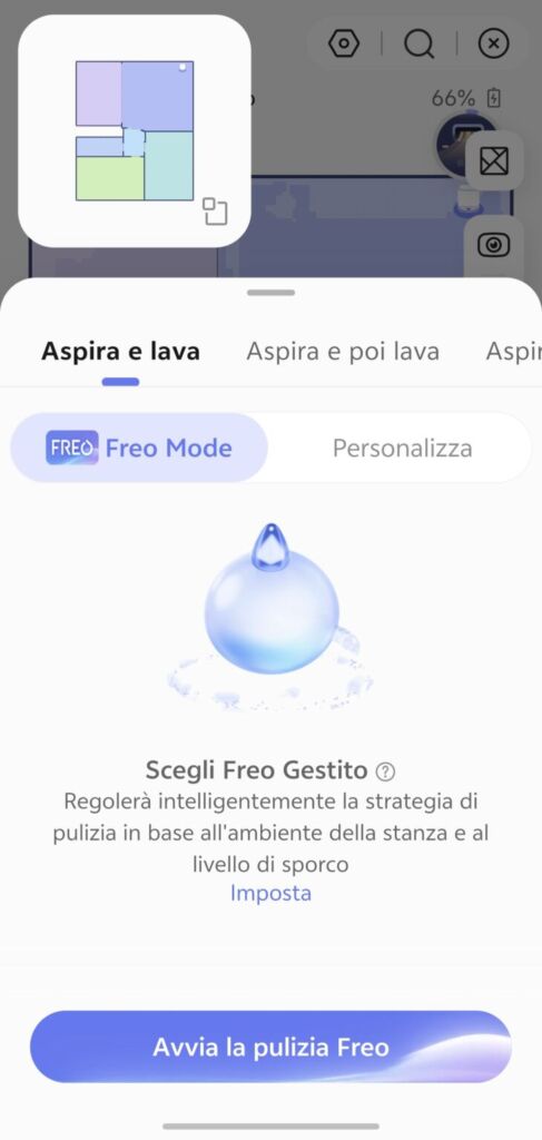 Режим уборки помещений по умолчанию: ФРЕО РЕЖИМ, то есть робот, благодаря своему искусственному интеллекту, будет выбирать наилучший режим уборки на основе обнаруженной грязи. Затем он отрегулирует мощность всасывания, количество подаваемой воды и количество проходов. Разумеется, это рекомендуемый режим, вам не придется ни о чем беспокоиться. Однако есть возможность все настроить, отключив режим FREO MODE. Отключив эту функцию, мы можем вручную задать количество проходов, мощность всасывания, подачу воды и уровень точности.