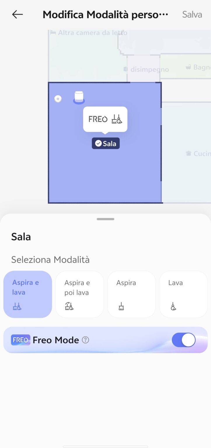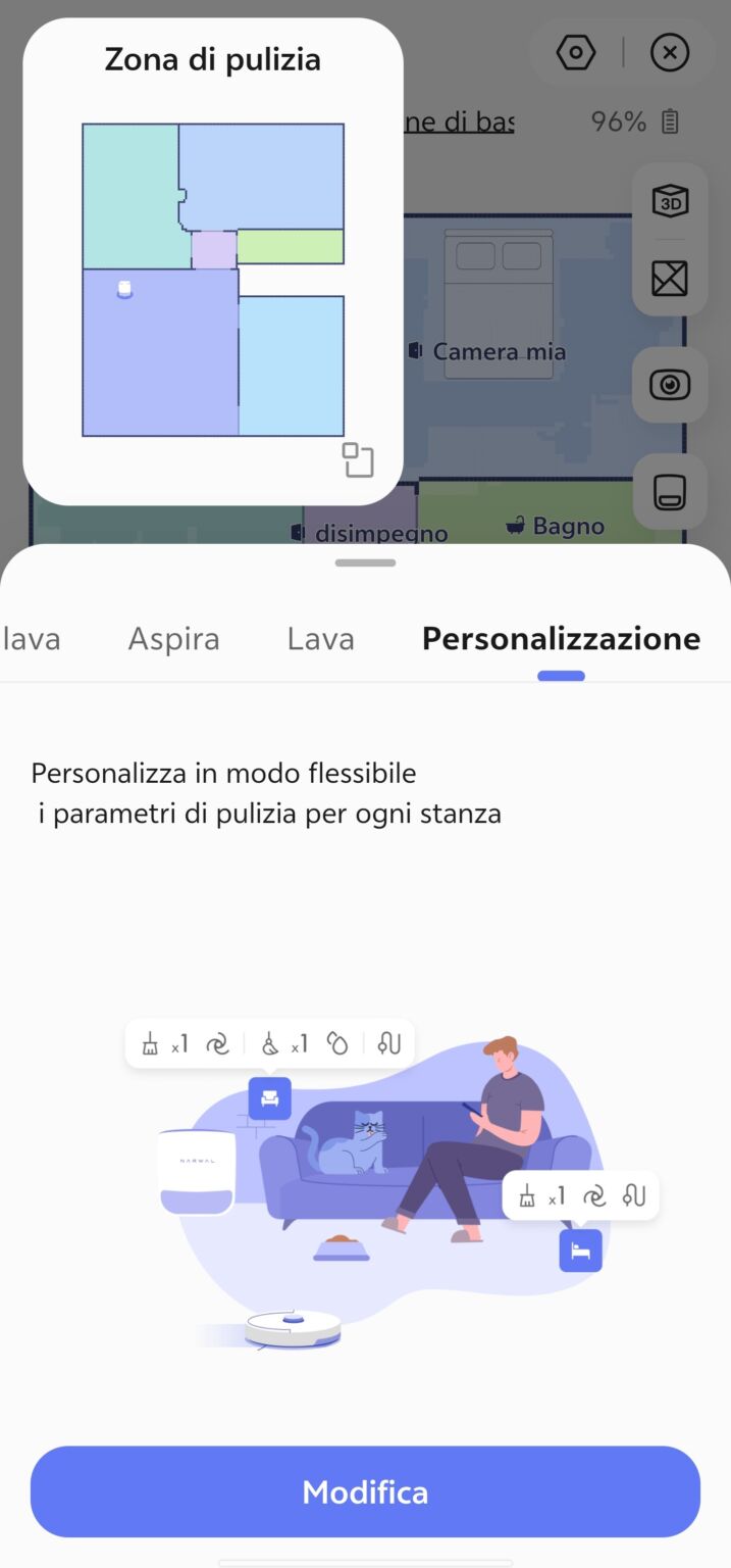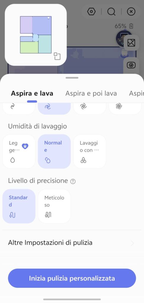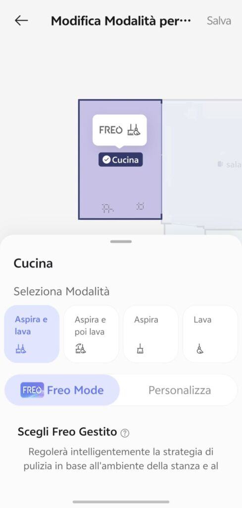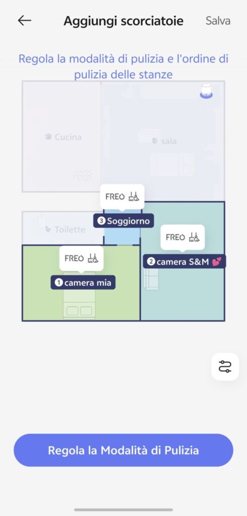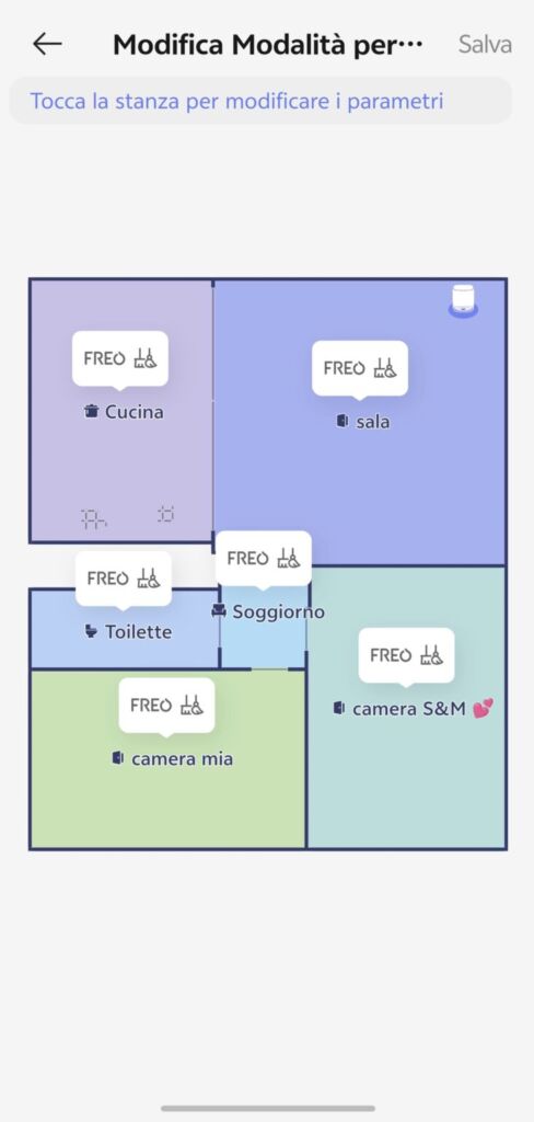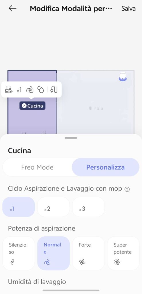 Эти режимы, если их не изменить с помощью пользовательский режим, будет использоваться для всех комнат. Если вы хотите исключить некоторые комнаты, например, из стирки, вам придётся использовать пользовательский режим. Нажав на кнопку "Индивидуализация"Вы можете решить, как убирать комнату за комнатой, фактически, как только вы нажмете на нее, комнаты будут выбраны, и в каждой комнате появится ряд значков, которые позволят нам решить, как убирать. Нажатие на настройку покажет вам, что вы включили в различных комнатах, нажатие на 2 точки откроет специальное меню, которое позволит вам вручную установить стирку для каждой комнаты.
