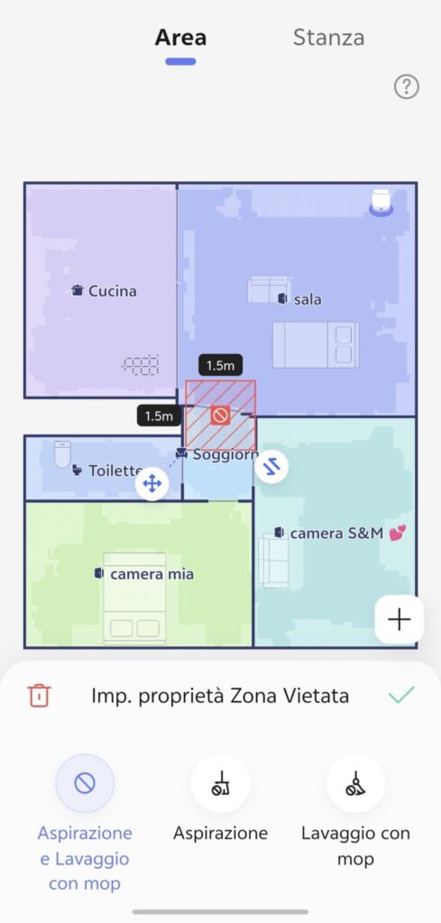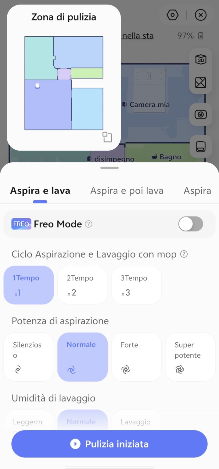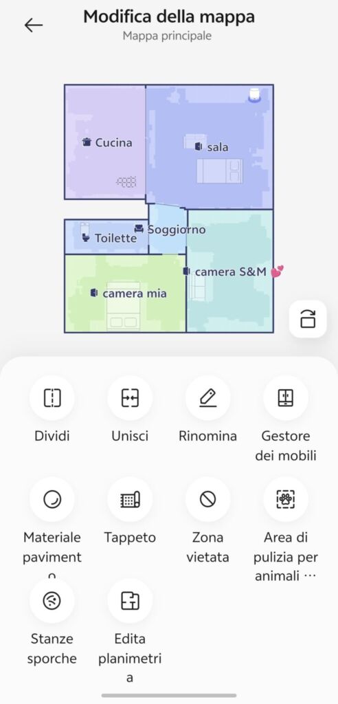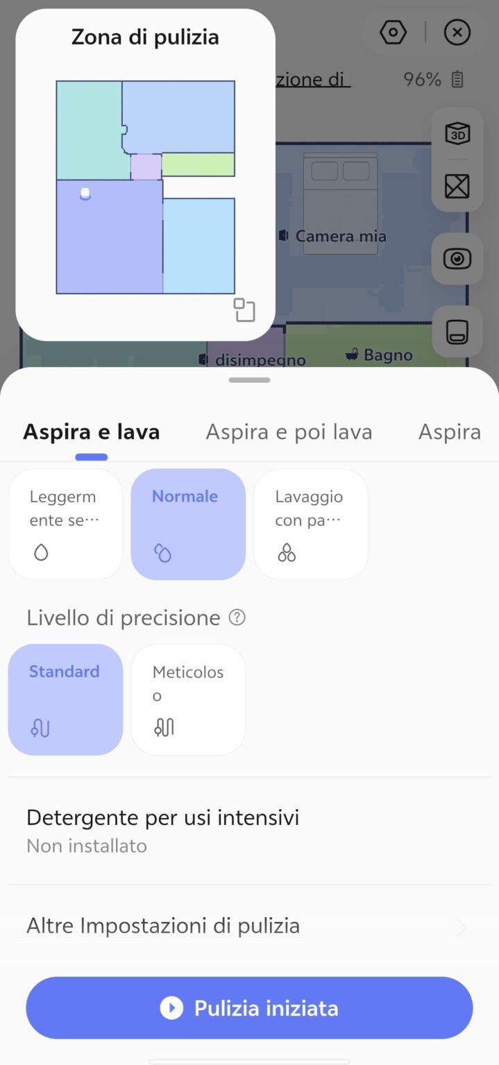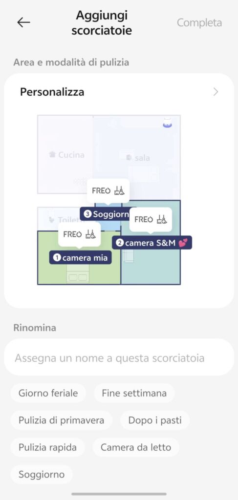 Эти режимы, если их не изменить с помощью пользовательский режим, будет использоваться для всех комнат. Если вы хотите исключить некоторые комнаты, например, из стирки, вам придётся использовать пользовательский режим. Нажав на кнопку "Индивидуализация"Вы можете решить, как убирать комнату за комнатой, фактически, как только вы нажмете на нее, комнаты будут выбраны, и в каждой комнате появится ряд значков, которые позволят нам решить, как убирать. Нажатие на настройку покажет вам, что вы включили в различных комнатах, нажатие на 2 точки откроет специальное меню, которое позволит вам вручную установить стирку для каждой комнаты.