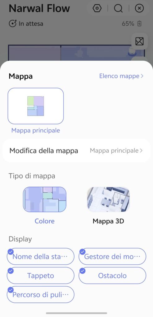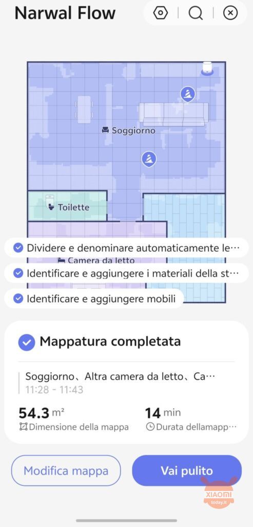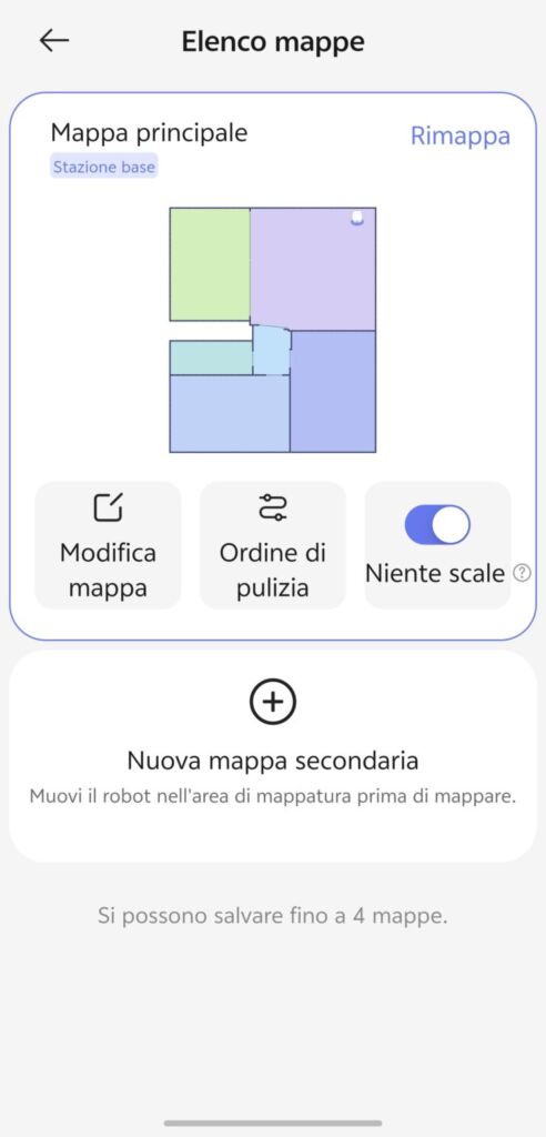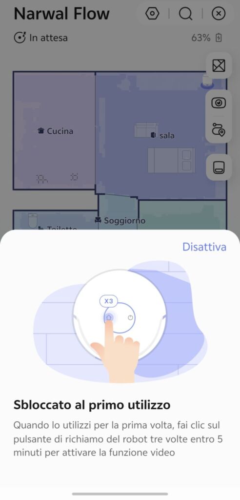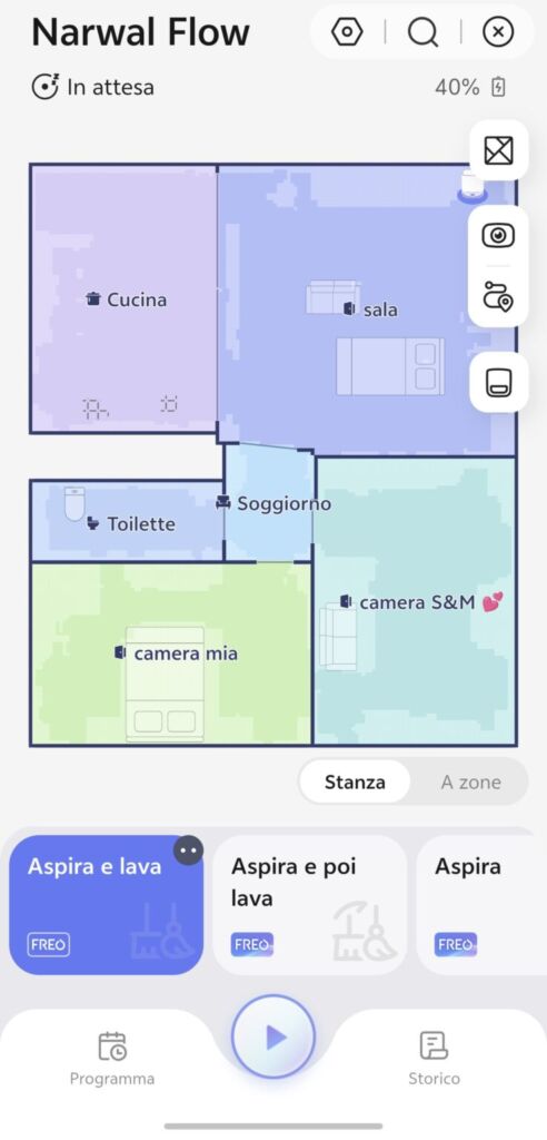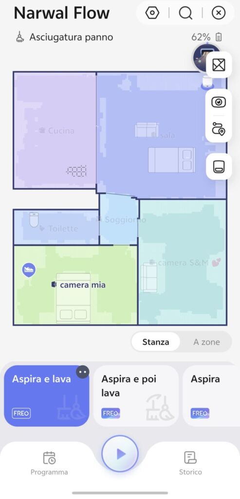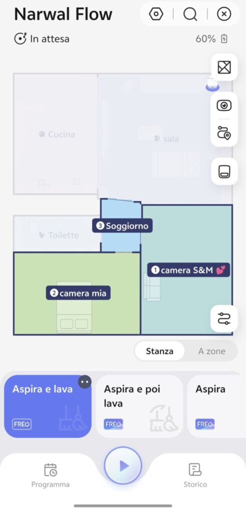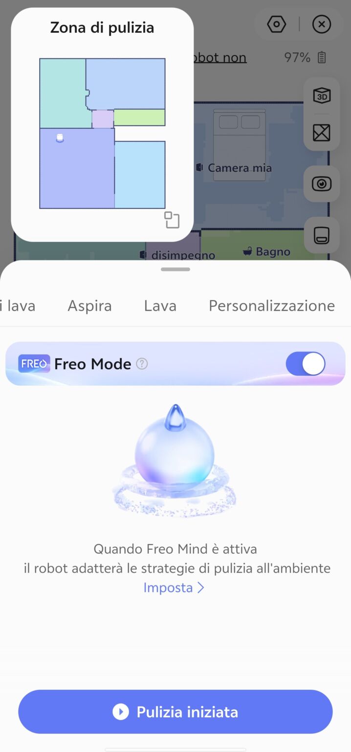Эти режимы, если их не изменить с помощью пользовательский режим, будет использоваться для всех комнат. Если вы хотите исключить некоторые комнаты, например, из стирки, вам придётся использовать пользовательский режим. Нажав на кнопку "Индивидуализация"Вы можете решить, как убирать комнату за комнатой, фактически, как только вы нажмете на нее, комнаты будут выбраны, и в каждой комнате появится ряд значков, которые позволят нам решить, как убирать. Нажатие на настройку покажет вам, что вы включили в различных комнатах, нажатие на 2 точки откроет специальное меню, которое позволит вам вручную установить стирку для каждой комнаты.