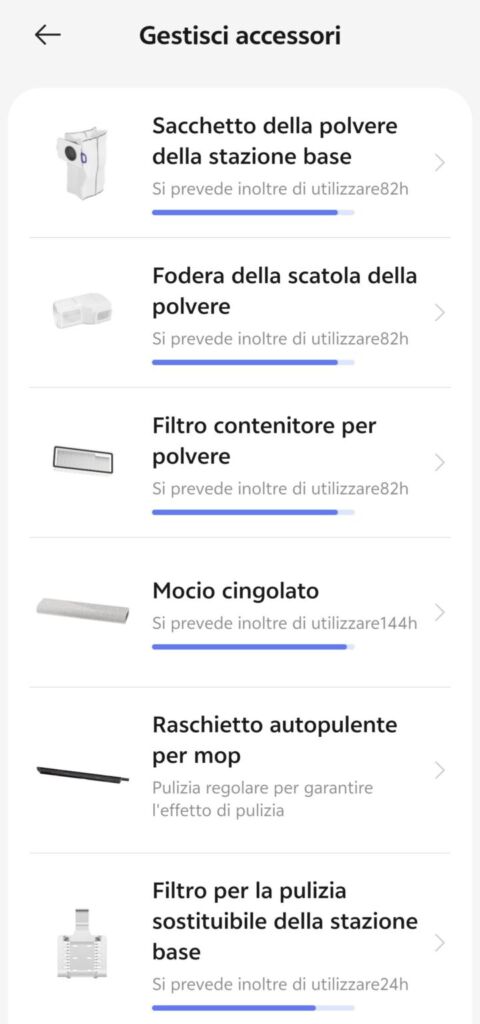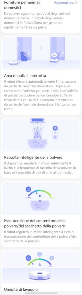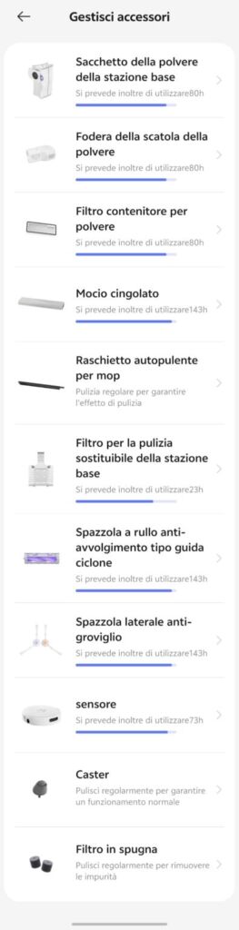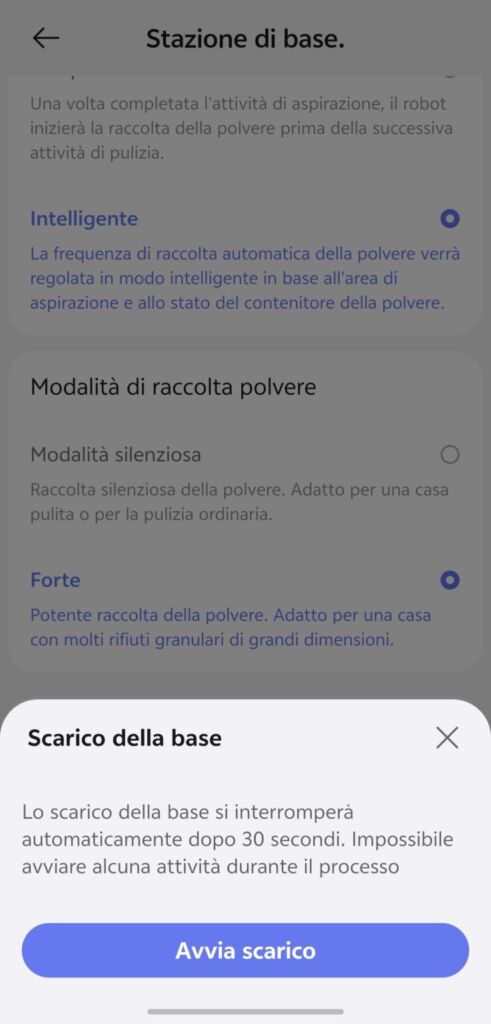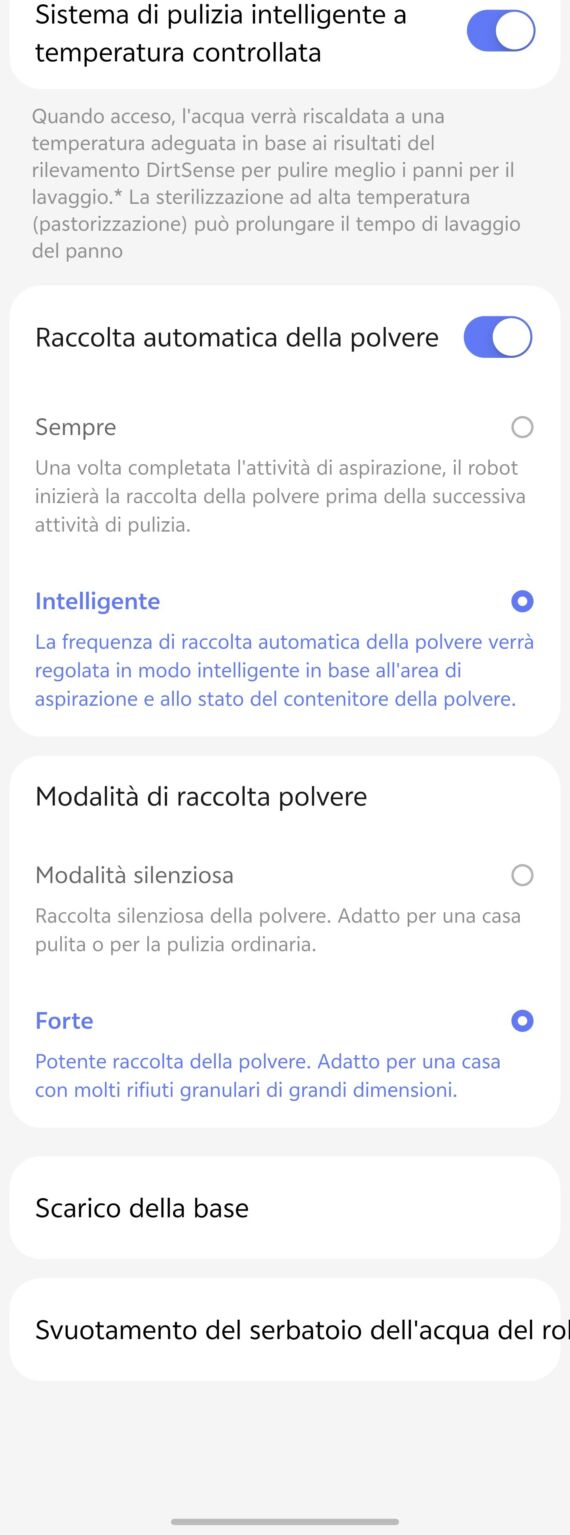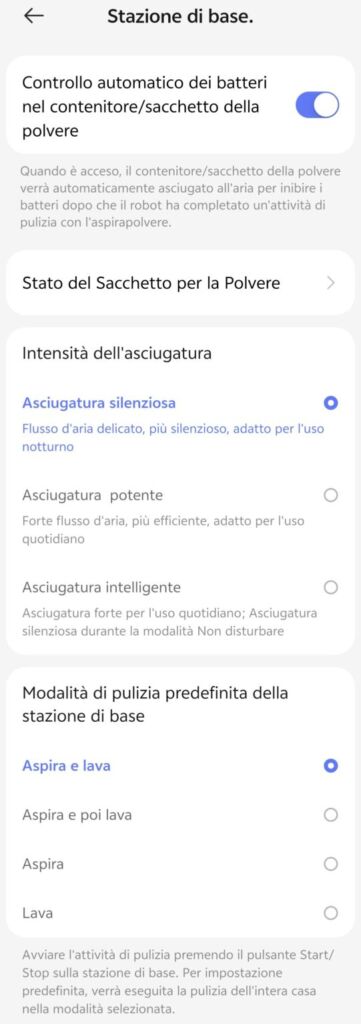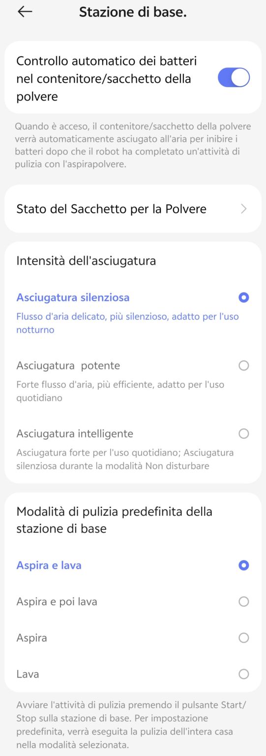 Швабра также всегда идеально моется внутри основания благодаря технологии Автомойка DirtSense. Фактически, база будет определять правильную температуру воды для стирки в зависимости от того, сколько грязи обнаружено на них, горячая вода, которая будет поступать из 45° a 60°. Финальная уборка с стерилизованная вода a 80° и сушка на воздухе при 45° Они уничтожат 99.99% бактерий. Пылесборник необходимо менять (или опорожнять) примерно каждые 120 дней. Не волнуйтесь, пылесборник и контейнер для пыли робота также стерилизуются горячим воздухом после каждого рабочего сеанса. Поддон, где робот находится для уборки и зарядки, также очищается. Я рекомендую снимать его и чистить вручную каждые 4-5 стирок, так как в нём скапливаются остатки грязи. Отсек для моющего средства убран, поэтому робот больше не будет добавлять его автоматически. Я не считаю это недостатком, так как это была удобная функция, но, возможно, лучше самостоятельно решать, сколько моющего средства насыпать в резервуар для чистой воды, исходя из ваших потребностей/вкусов.