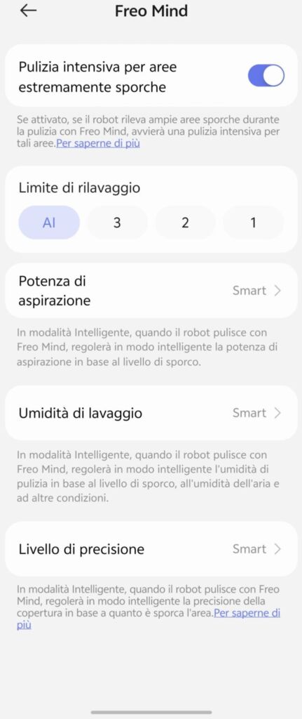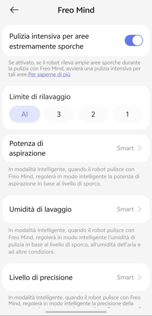 Если мы не используем «режимИндивидуализация“, как уже упоминалось, уборка всех помещений будет производиться в одном и том же установленном режиме. Что касается “ФРЕО РЕЖИМ” также есть возможность настроить этот интеллектуальный режим. На экране, где выделен режим FREO MODE, нажмите «установить», и вы окажетесь на экране его конфигурации. Здесь у нас будет возможность изменить параметры очистки или оставить их на «интеллектуальном», чтобы робот управлял ими самостоятельно, нажав «налог«Ну, честно говоря, эта возможность изменения параметров в «автоматическом» режиме меня не убеждает... на самом деле мой совет — оставить их все на «умном» режиме».