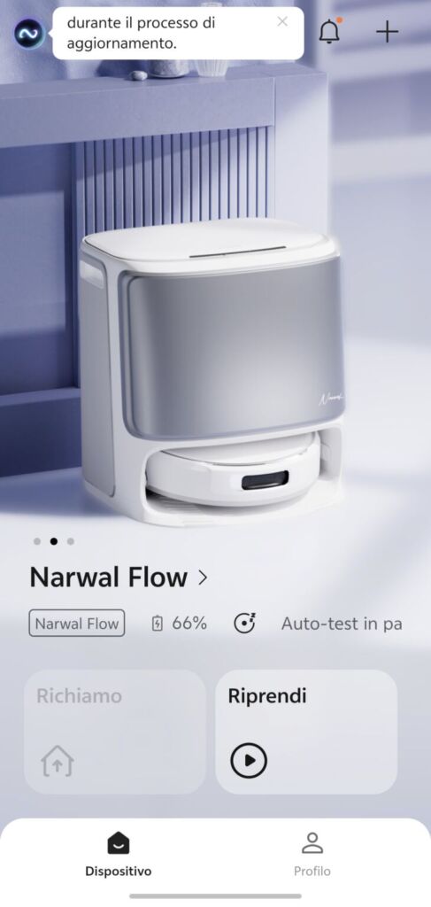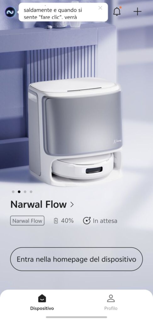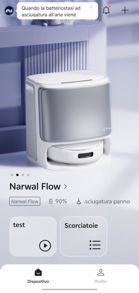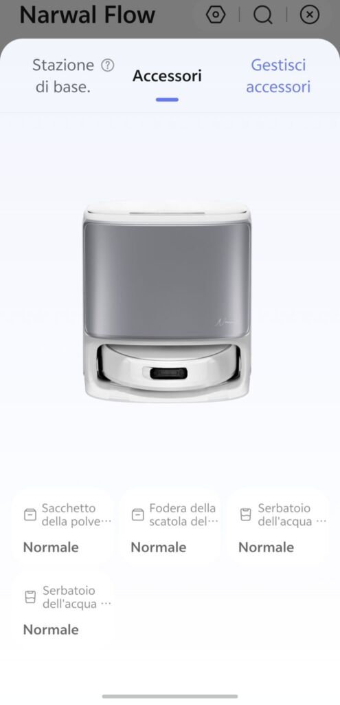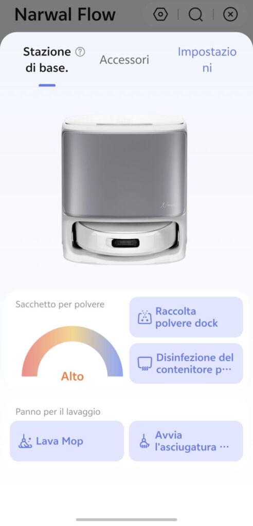Зарядная станция с функцией мытья швабры оснащена двумя резервуарами для чистой и грязной воды, пылесборником, сенсорной кнопкой для прямого доступа к некоторым функциям и системой мытья швабры. Резервуары для воды в хорошем состоянии. 5L что из'чистая вода e 4.75L что изГрязная вода, Размеры 40 х 43 х 46cm для веса 10.8KgНо как это работает? Всё очень просто: достаточно заполнить бак чистой воды водой и моющим средством. В этот момент, когда запускается сеанс уборки, включающий мытьё, робот перемещается на станцию, и его ролик промывается водой и моющим средством. В приложении (которое мы рассмотрим позже) можно задать, через сколько м² (15-20-30 м²) робот должен возвращаться на станцию для тщательной очистки швабры (помните, что во время мытья она будет омываться водой из внутреннего бака). Для этого используется горячая вода из 45° ai 60° В зависимости от типа обнаруженной грязи и состояния внутреннего бака, Flow, помимо этого, запускает полный цикл самоочистки. Станция подает горячую воду под высоким давлением в бак для грязной воды, а двигатель создает мощный вихревой поток, который тщательно очищает все внутренние поверхности. Одновременно вода под давлением омывает скребок. Затем швабра очищается двусторонним вращением и сушится горячим воздухом. Этот интегрированный процесс тщательно восстанавливает каждый компонент — бак, скребок и швабру — без вмешательства пользователя. Система поддерживает абсолютную гигиену на всем протяжении пути прохождения воды, гарантируя, что каждый новый цикл уборки начинается в оптимальных условиях: с чистой шваброй и опорожненным и промытым баком для грязной воды.