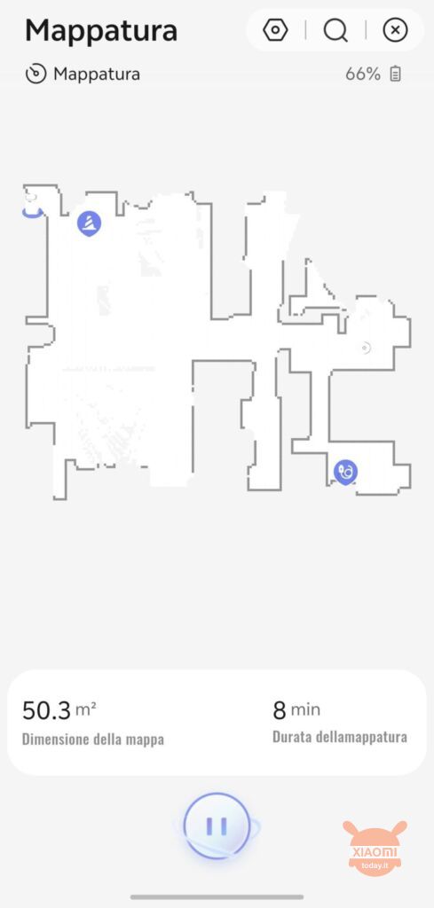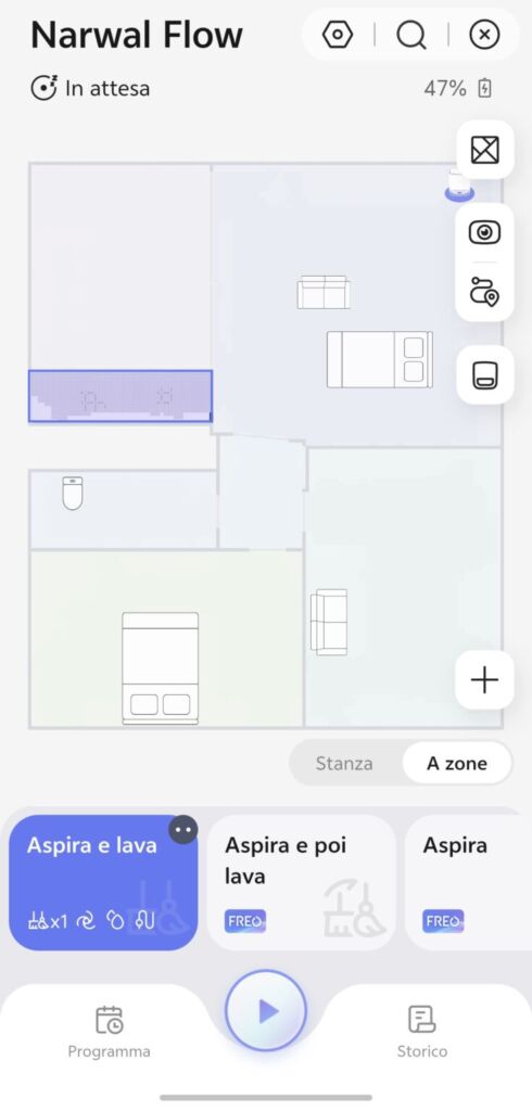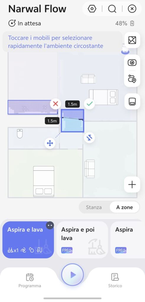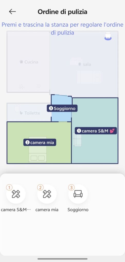 Чуть выше мы находим 2 ссылки, комната e зона Их можно использовать для уборки отдельных комнат или выбранных участков дома (вы можете добавить столько зон и размеров, сколько захотите). По умолчанию вы находитесь в режиме уборки «комнат», где видите всю карту дома со всеми комнатами. Чтобы открыть вид «зон», просто нажмите на «зоны» и наоборот. Запуск уборки нажатием центральной кнопки воспроизведения очистит все комнаты; если вы хотите убрать только определённые комнаты, вам нужно выбрать их, нажав на них. Что касается порядка уборки, помните, что он будет соответствовать выбранному вами порядку. Если вы хотите изменить его, вы можете: Для зон: после выбора «зон» появится изменяемый по размеру квадрат, который можно переместить на все области дома.