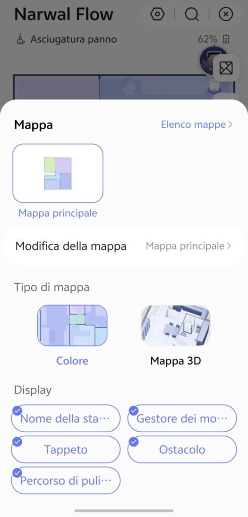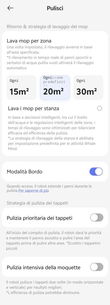 ясно: очень важное меню, по сути мы сможем настроить стратегию мытья швабры (каждые 15-20-30 квадратных метров или в конце каждой комнаты). Также мы сможем выбрать, будет ли режим мытья швабры очистка кромок Это будет сделано путём выдвижения швабры, поэтому, очевидно, оставьте эту функцию включённой. После этого у нас появится возможность сначала чистить ковер, когда швабра ещё сухая, включив «Приоритетную чистку ковра», или дважды пройтись по коврам (интенсивная чистка).