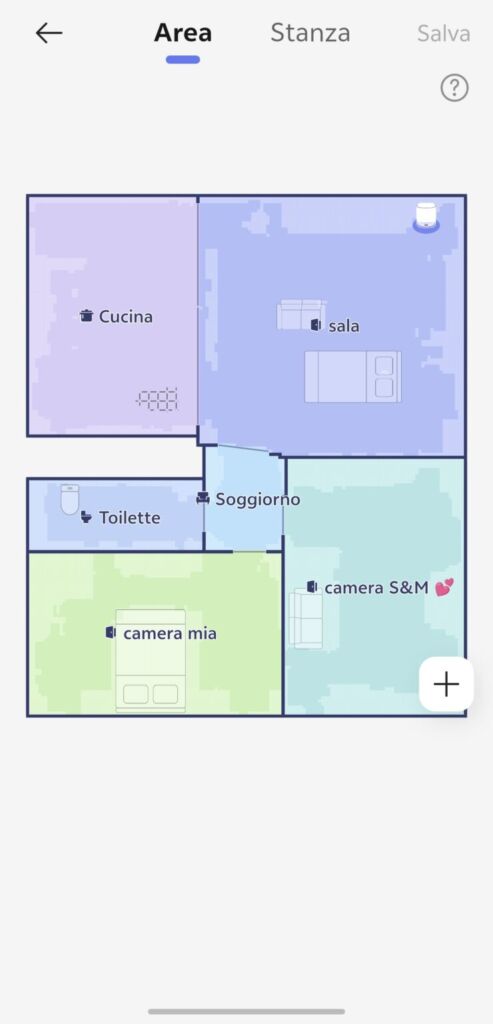 Если вам нужно убрать только один участок дома, это не проблема. На главном экране нажмите «зона(по умолчанию это «комнаты»). На этом этапе появятся все комнаты в доме. Квадрат будет первой областью для отрисовки, а кнопка «+» будет в правом нижнем углу. Если вам нужно убрать только одну область, вы можете изменить её размер, используя квадрат по умолчанию (нажмите зелёную кнопку «V» для подтверждения). Если вам нужно добавить больше областей, нажмите кнопку «+», и появится ещё один квадрат, который и будет новой областью для уборки. Конечно, вы также можете изменять его размер и перемещать по своему усмотрению. Вы можете добавить любое количество комнат и выбрать тип уборки для каждой области: свободный режим или пользовательский.
