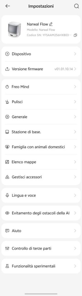 На странице карт, нажав на шестиугольный значок в правом верхнем углу, мы войдем в меню общих настроек. Здесь мы найдем очень важные настройки, которые следует применять для достижения идеальной очистки в соответствии с нашими потребностями. Что касается прошивки, вы будете уведомлены о выходе новых версий. Для их установки робот должен иметь минимальный рекомендуемый уровень заряда 40%.