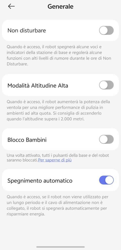 - Автоматическое выключение: ключевой пункт меню. Если этот пункт включен, робот будет выключаться, если он не подключен к базе и, следовательно, отключен от сети. Настоятельно рекомендую оставить его включённым, чтобы робот не оказался без питания, когда вам нужно его использовать. К сожалению, установить таймаут невозможно, и, на мой взгляд, выключение слишком запоздало, так как добрых 20% заряда аккумулятора всё равно будет разряжено.