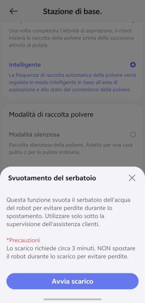 - Опорожнение резервуара для воды робота: интересное и спорное меню, позвольте мне объяснить. Если вам нужно переместить робота, имеет смысл опорожнить его внутренний резервуар, чтобы избежать пролива воды во время мойки. Однако указано, что эта операция должна выполняться под наблюдением службы поддержки клиентов, поскольку считается опасной. Я поищу информацию по этому вопросу и при необходимости обновлю этот раздел.